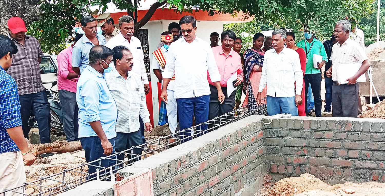 கட்டுமான பணிகளை கலெக்டர் குமாரவேல் பாண்டியண் ஆய்வு செய்த காட்சி.
