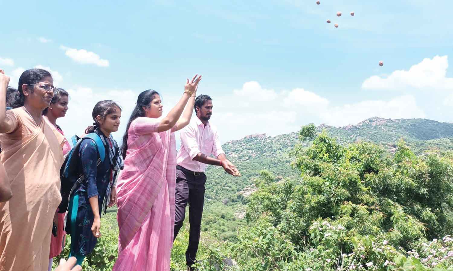 வேலூர் பாலமதி மலையில் விதை பந்துகள் வீசிய காட்சி.