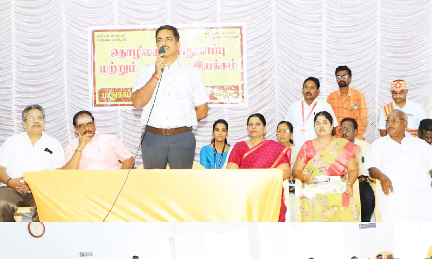 வேலூர் மாவட்டம், குடியாத்தத்தில் உள்ள தனியார் திருமண மண்டபத்தில் தீப்பெட்டி மற்றும் பட்டாசு தொழிற்சா லைகளில் ஏற்படும் தீவிபத்துகளை தவிர்ப்பது மற்றும் விபத்தில்லா பட்டாசு உற்பத்தி குறித்து பட்டாசு மற்றும் தீப்பெட்டி தொழிற்சாலையில் பணிபுரியும் தொழிலா ளர்களுக்கு பாதுகாப்பு பயிற்சி, விழிப்புணர்வு முகாம் கலெக்டர் குமாரவேல் பாண்டியன் தலைமையில் இன்று நடைபெற்றது.
