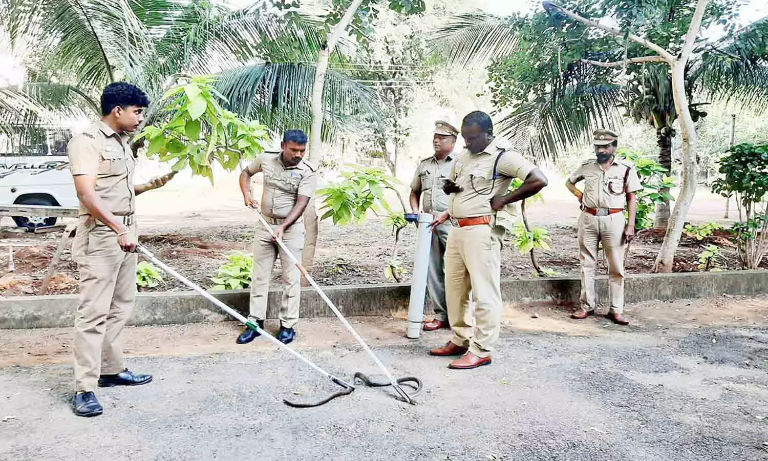போலீஸ் சூப்பிரண்டு ராஜேஷ் கண்ணன் முன்னிலையில் பாம்பு பிடிக்கப்பட்ட காட்சி.