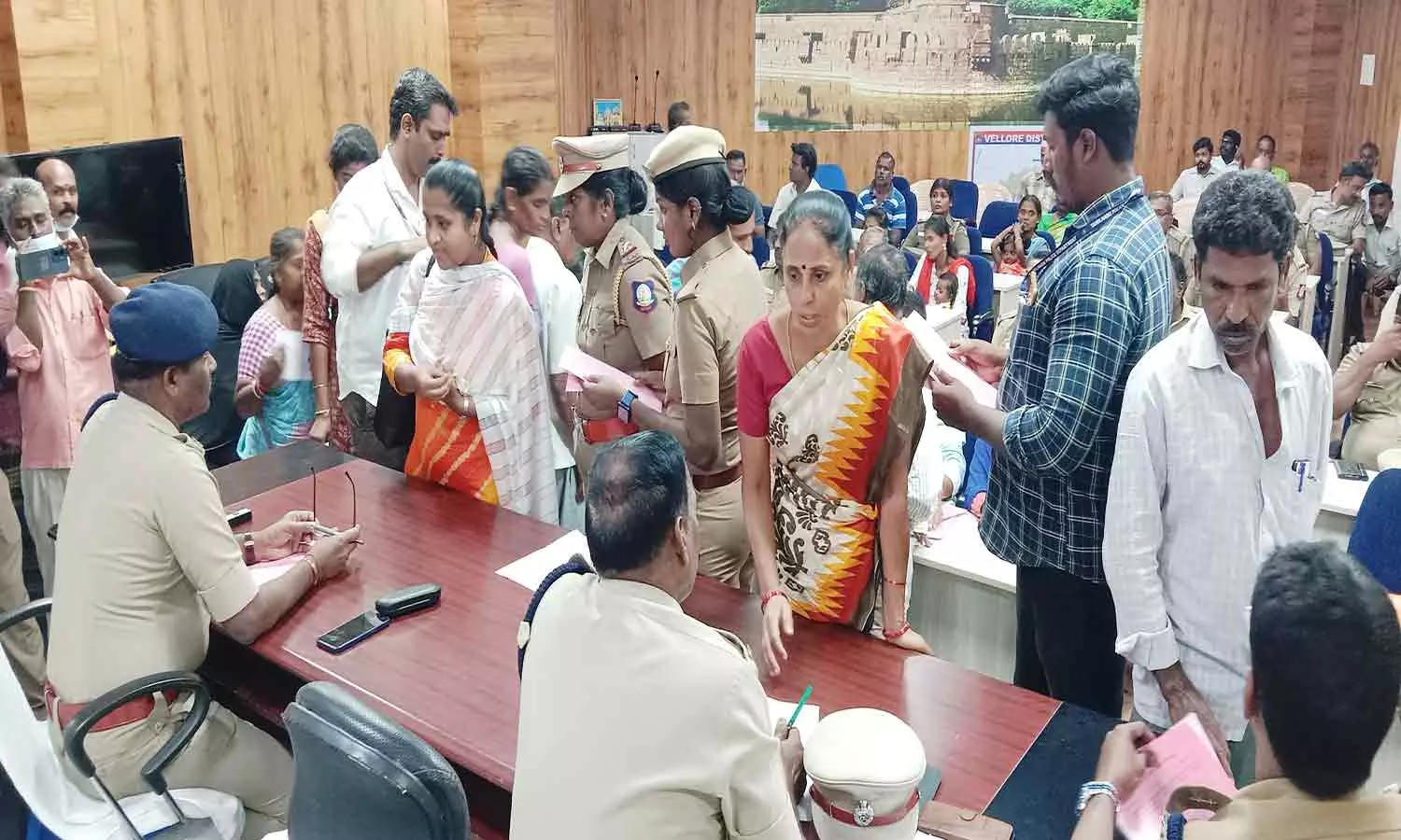 வேலூர் எஸ்.பி.அலுவலகத்தில் இன்று காலை போலீஸ் சூப்பிரண்டு மணிவண்ணன், கூடுதல் போலீஸ் சூப்பிரண்டு பாஸ்கரன் ஆகியோர் பொதுமக்களிடம் இருந்து மனுக்களை பெற்றனர்.