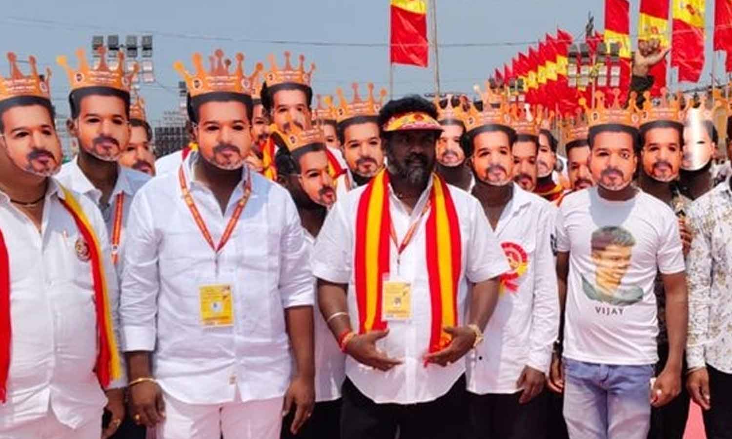 தமிழக வெற்றிக் கழகத்தின் முதல் மாநாடு விக்கிரவாண்டி வி.சாலையில் இன்று மாலை நடைபெற உள்ளது. இந்த மாநாட்டில் கலந்து கொள்வதற்காக ரசிகர்கள் திரளாக வந்த வண்ணம் உள்ளனர். விஜய்-ன் முகமூடி அணிந்த படி தொண்டர்கள் மாநாட்டுக்கு வந்துள்ளனர்.