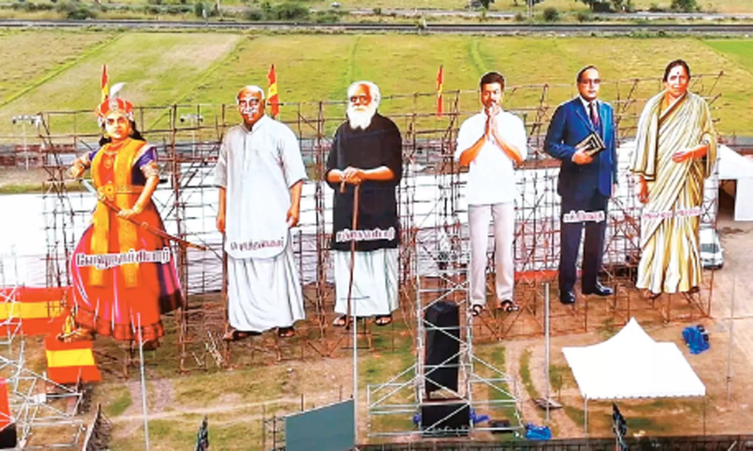 விஜய் எந்த மாதிரியான அரசியலை முன்னெடுக்கப்போகிறார் என்று பலரும் கேள்விகளை அவரை நோக்கி வீசி வந்த சூழலில், மாநாட்டு திடலில் இடம் பெற்றுள்ள கட்-அவுட்கள் பலரது கவனத்தையும் ஈர்த்து வருகிறது.