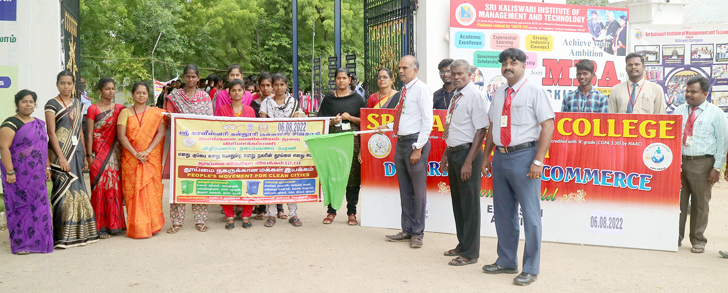 சிவகாசி காளீஸ்வரி கல்லூரி இளங்கலை வணிகவியல் துறையில் விரிவாக்க பணி சார்பில் ''எனது குப்பை எனது பொறுப்பு, எனது நகரின் தூய்மை, எனது கடமை '' என்ற தலைப்பை மையமாக கொண்டு விழிப்புணர்வு நடைபயண பேரணி நடந்தது.