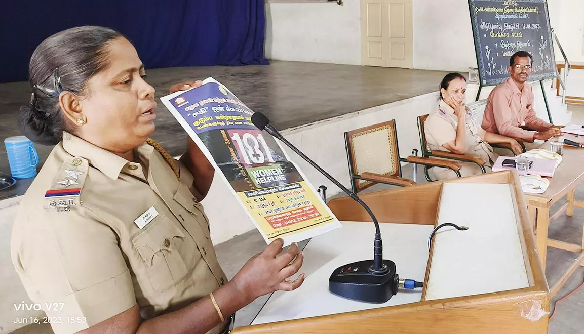 சிக்கலான சூழ்நிலைகளில் மாணவிகள் உடனடியாக, 1098, 181, 100, 155260 என்ற புகார் எண்களில் தொடர்புகொண்டு உதவி கேட்பதும் குறித்தும் எடுத்துரைத்தார். கூட்டத்தில் 700-க்கும் மேற்பட்ட மாணவ மாணவிகள் பங்கேற்றனர். சப்-இன்ஸ்பெக்டர் கிறிஸ்டி, காவலர் சங்கரேசுவரி ஆகியோர் கலந்து கொண்டனர். உதவி தலைமையாசிரியர் இளையபெருமாள் நன்றி கூறினார்.