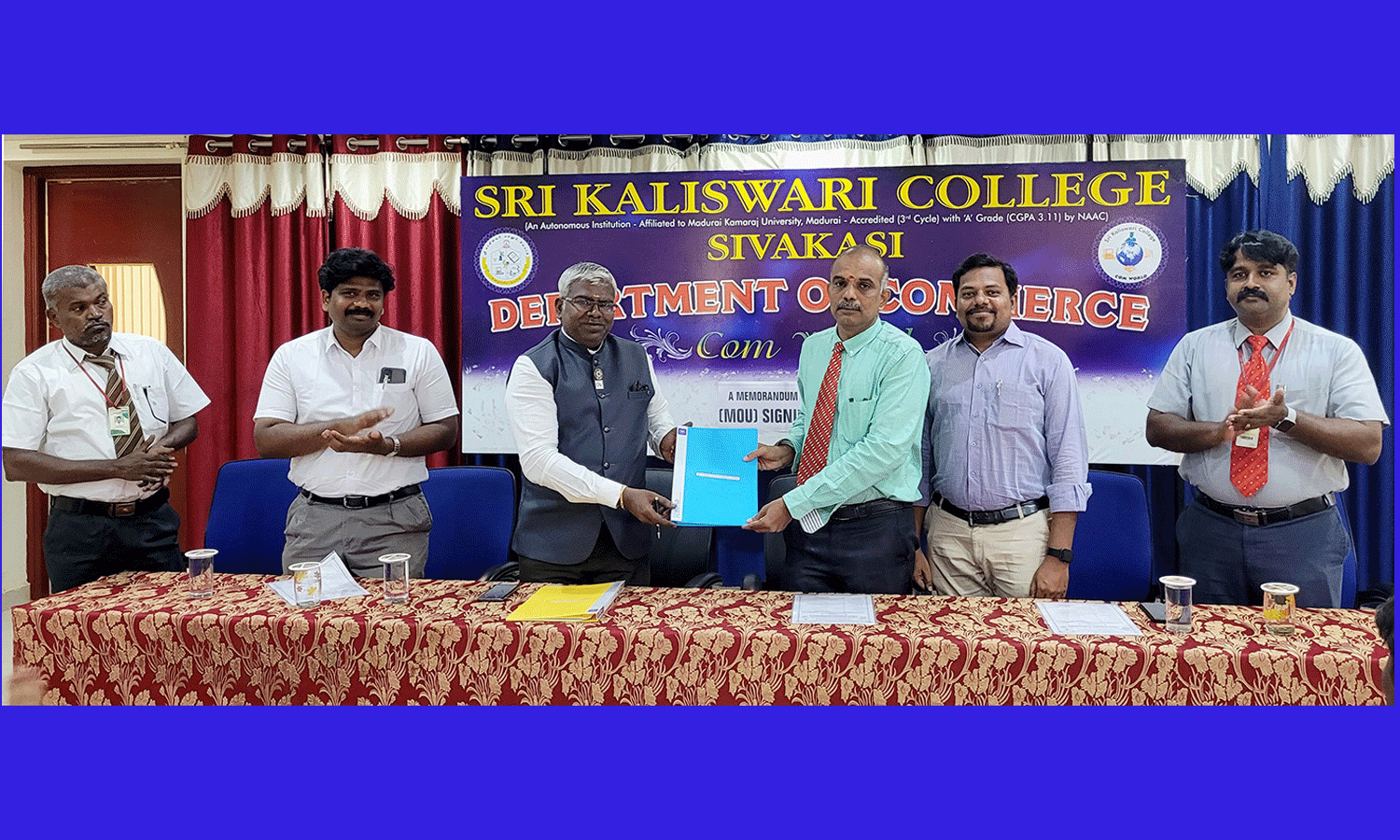 சிவகாசி காளீஸ்வரி கல்லூரியின் இளங்கலை வணிகவியல் துறை மற்றும் பட்டயக் கணக்காளர்கள் சம்மேளன சிவகாசி கிளை இடையே புரிந்துணர்வு ஒப்பந்தம் கையொப்பமிடும் நிகழ்ச்சி நடந்தது.
