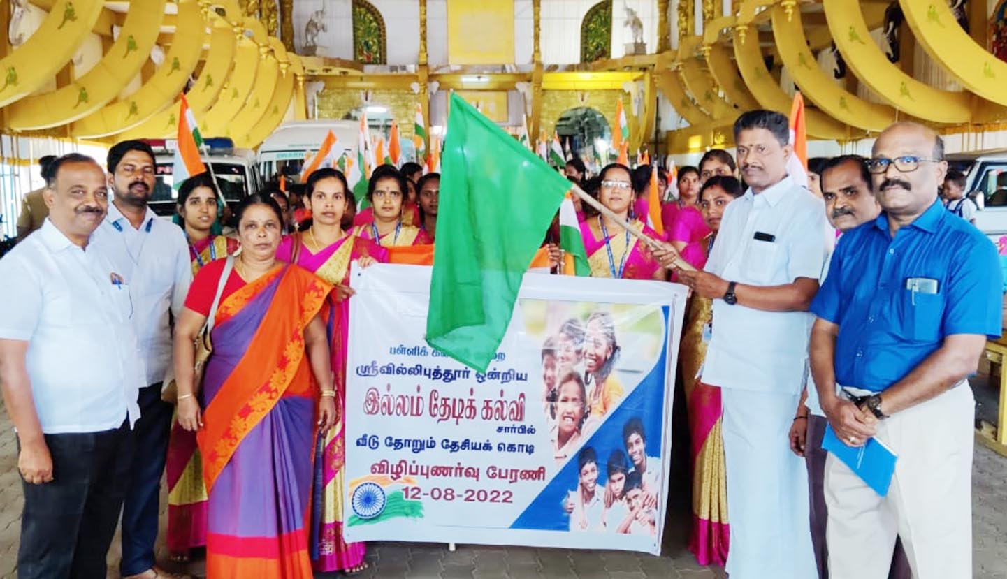 விருதுநகர் மாவட்டம், ஸ்ரீவில்லிபுத்தூரில் இல்லம் தேடி கல்வி திட்டத்தின் தன்னார்வலர்கள் பங்கேற்ற வீடுதோறும் தேசிய கொடி விழிப்புணர்வு பேரணி நடந்தது. ஆண்டாள் கோவில் முன்பு, பேரணியை திட்டத்தின் ஒருங்கிணைப்பாளர் ஜெயக்குமார் ஞானராஜ் தலைமையில், நகர்மன்றத் துணைத் தலைவர் செல்வமணி கொடியசைத்துத் தொடங்கி வைத்தார்.