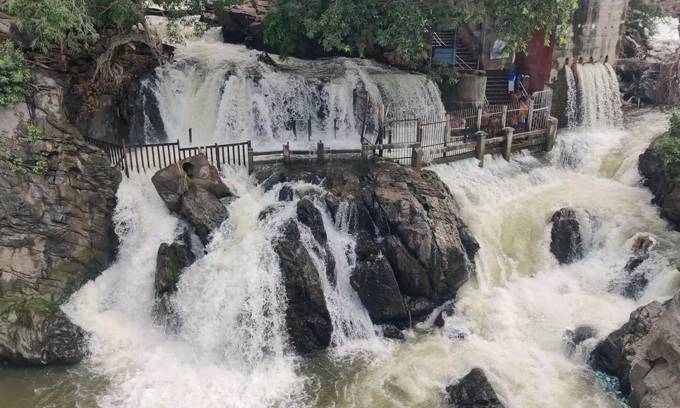 ஓகேனக்கல் மெயின் அருவியில் தண்ணீர் ஆர்ப்பரித்து கொட்டும் காட்சி.