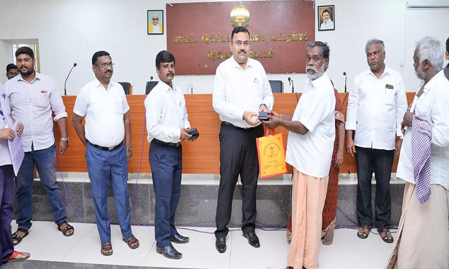 நலத்திட்ட உதவிகளை கலெக்டர் ரவிச்சந்திரன் வழங்கிய காட்சி.
