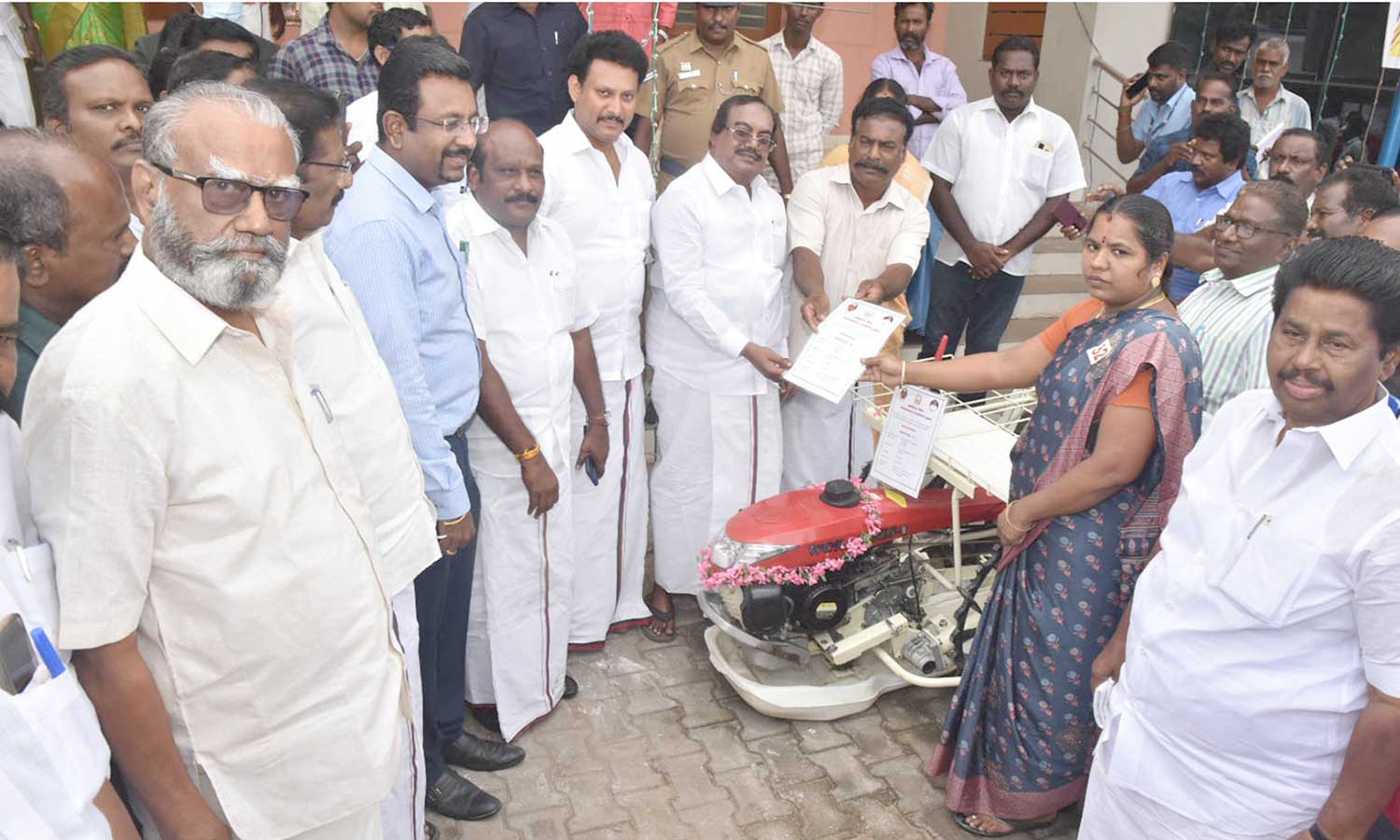 பயனாளி ஒருவருக்கு நெல் நடவு எந்திரத்தை சட்டபேரவை துணை தலைவர் பிச்சாண்டி வழங்கினார்.
