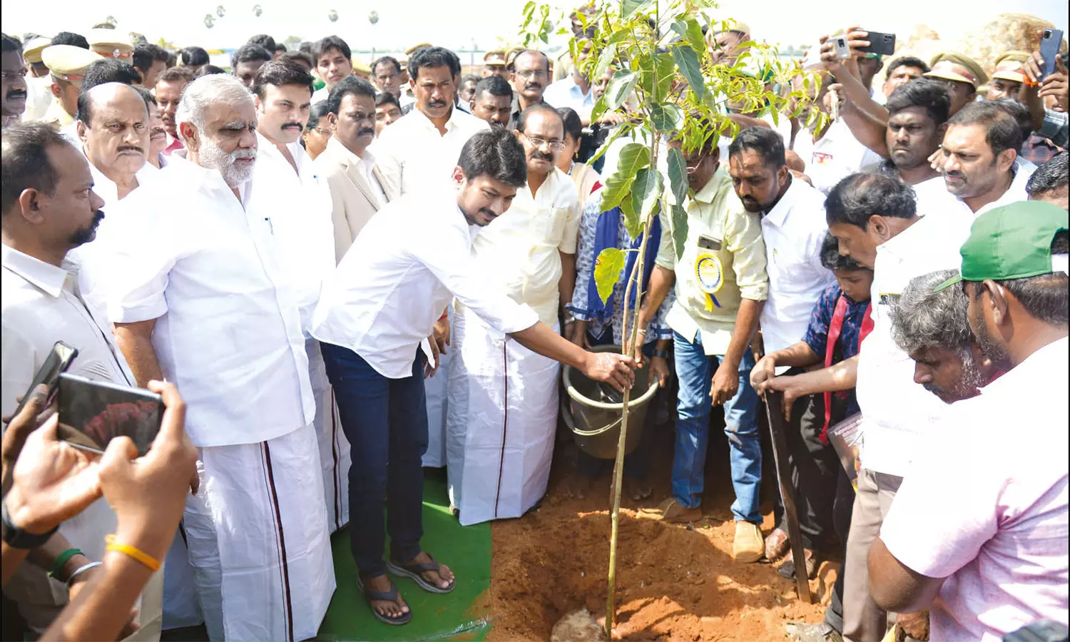 அமைச்சர் உதயநிதி ஸ்டாலின் கலந்து கொண்டு மரக்கன்று நட்டபோது எடுத்த படம்.