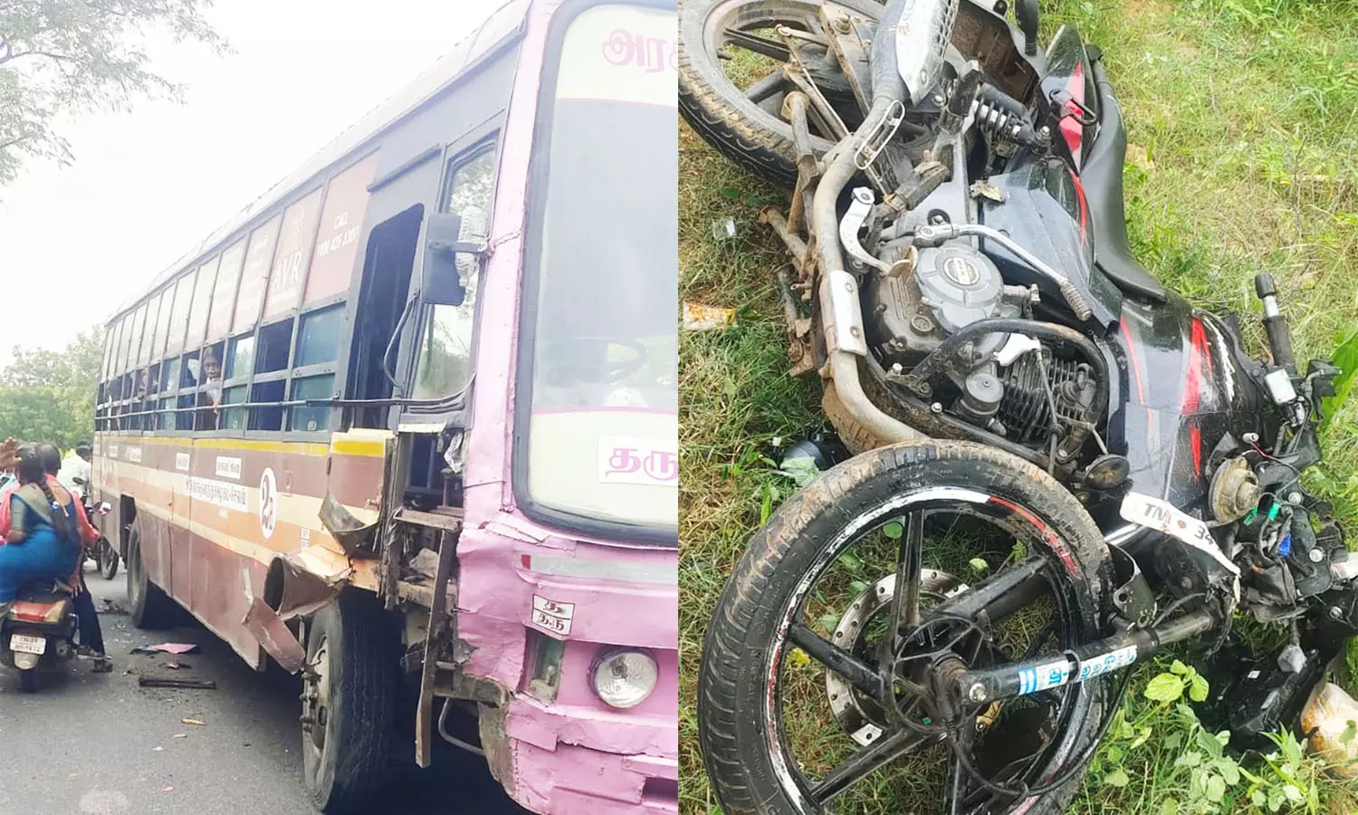 விபத்தில் சேதமடைந்த பஸ்சையும், இருசக்கர வாகனத்தையும் படத்தில் காணலாம்.