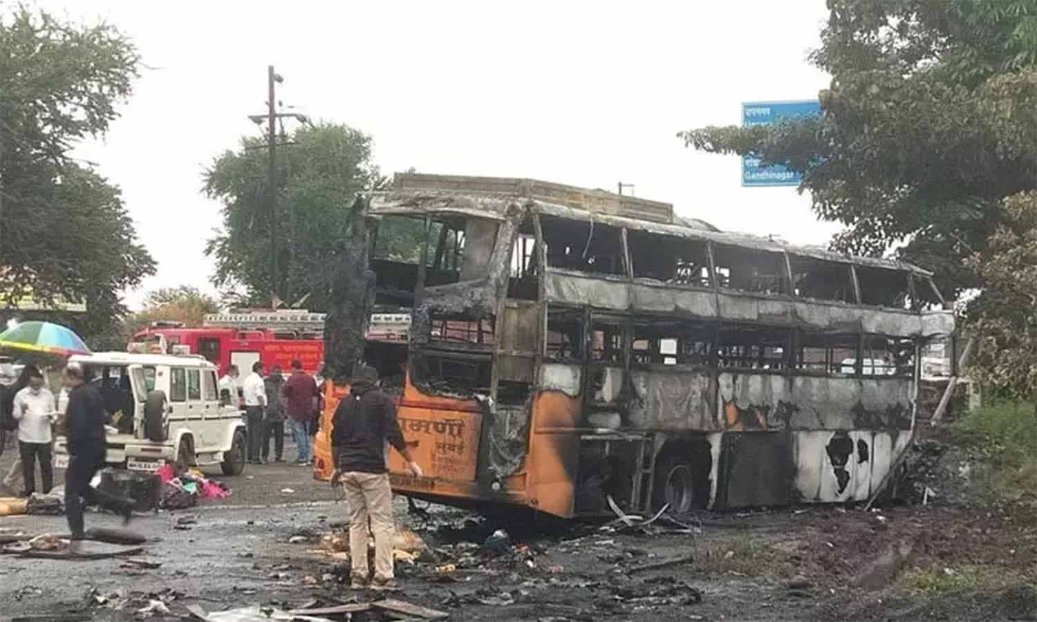 மகாராஷ்டிர மாநிலம் நாசிக் நகரின் அவுரங்காபாத் சாலையில் பயணிகளை ஏற்றிக் கொண்டு சென்ற பஸ் ஒன்று இன்று அதிகாலை லாரி மீது மோதி விபத்திற்குள்ளானது. மோதிய வேகத்தில் பஸ் தீப்பிடித்தது. சிறிது நேரத்தில் தீ மளமளவென பரவி பஸ் முழுவதும் பற்றி எரிய தொடங்கியது. இதனால், பஸ்சுக்குள் சிக்கிக்கொண்ட பயணிகள் வெளியே வர முடியாமல் பரிதவித்தனர்.