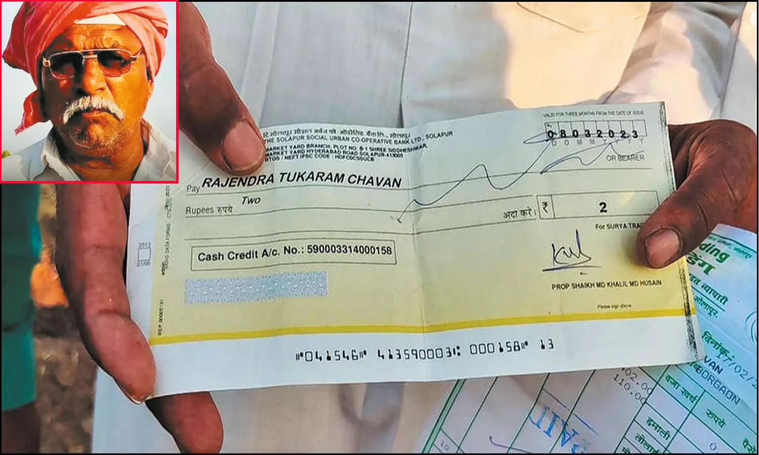 ராஜேந்திர துக்காராம் சவான், விவசாயிக்கு ரூ.2-க்கு வழங்கப்பட்ட காசோலை.