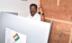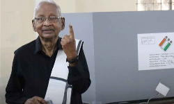 சென்னை அடையாறு பகுதியில் உள்ள வாக்குச்சாவடியில் திராவிடர் கழகத் தலைவர் கி. வீரமணி வாக்களித்தார்.