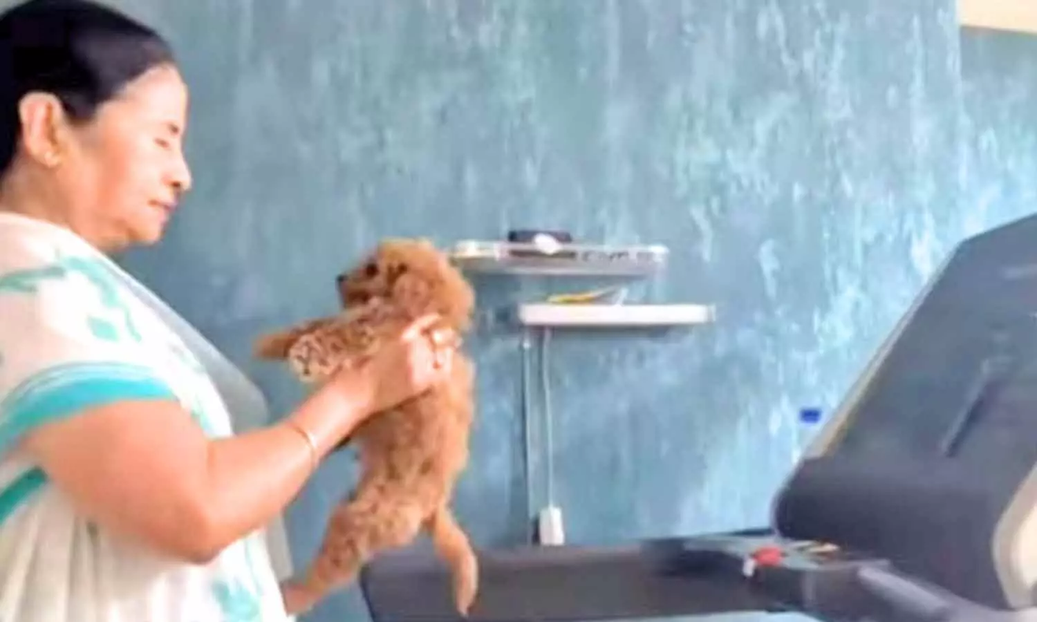 நாய்க்குட்டியை கையில் வைத்து கொண்டு உடற்பயிற்சி செய்யும் மம்தா பானர்ஜி