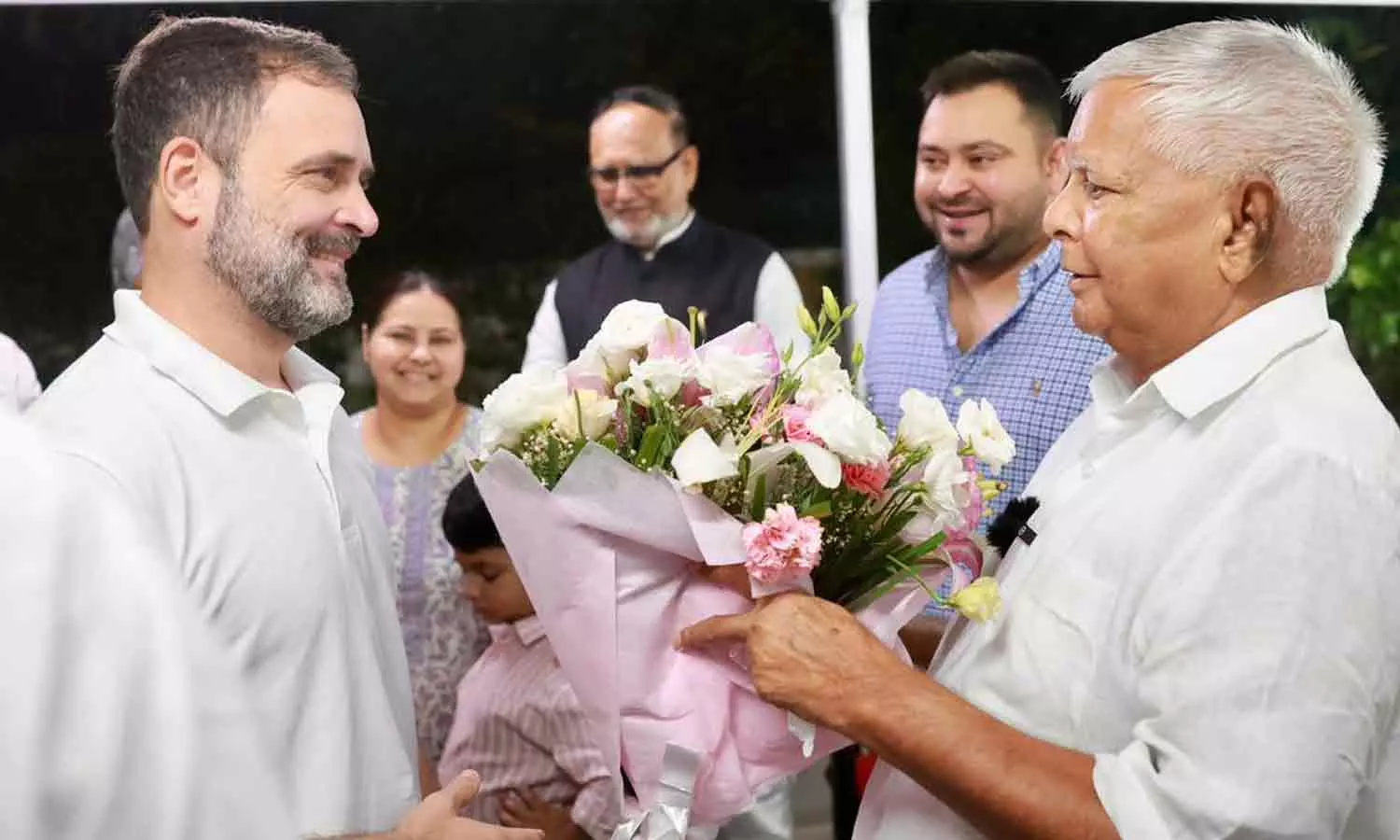 விருந்துக்கு வந்த ராகுல் காந்தியை லாலுபிரசாத் யாதவ் கட்டியணைத்து வரவேற்றார். அவருக்கு பூச்செண்டும் வழங்கினார்.