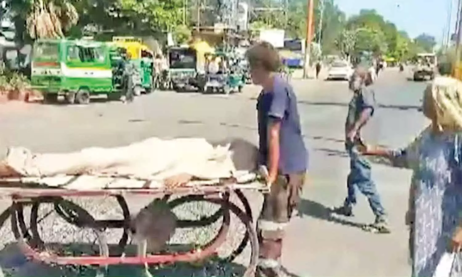 உத்தரபிரதேசத்தில் வாகனம் கிடைக்காததால் இறந்த மகனின் உடலை தள்ளுவண்டியில் ஏற்றி சென்ற பெண்