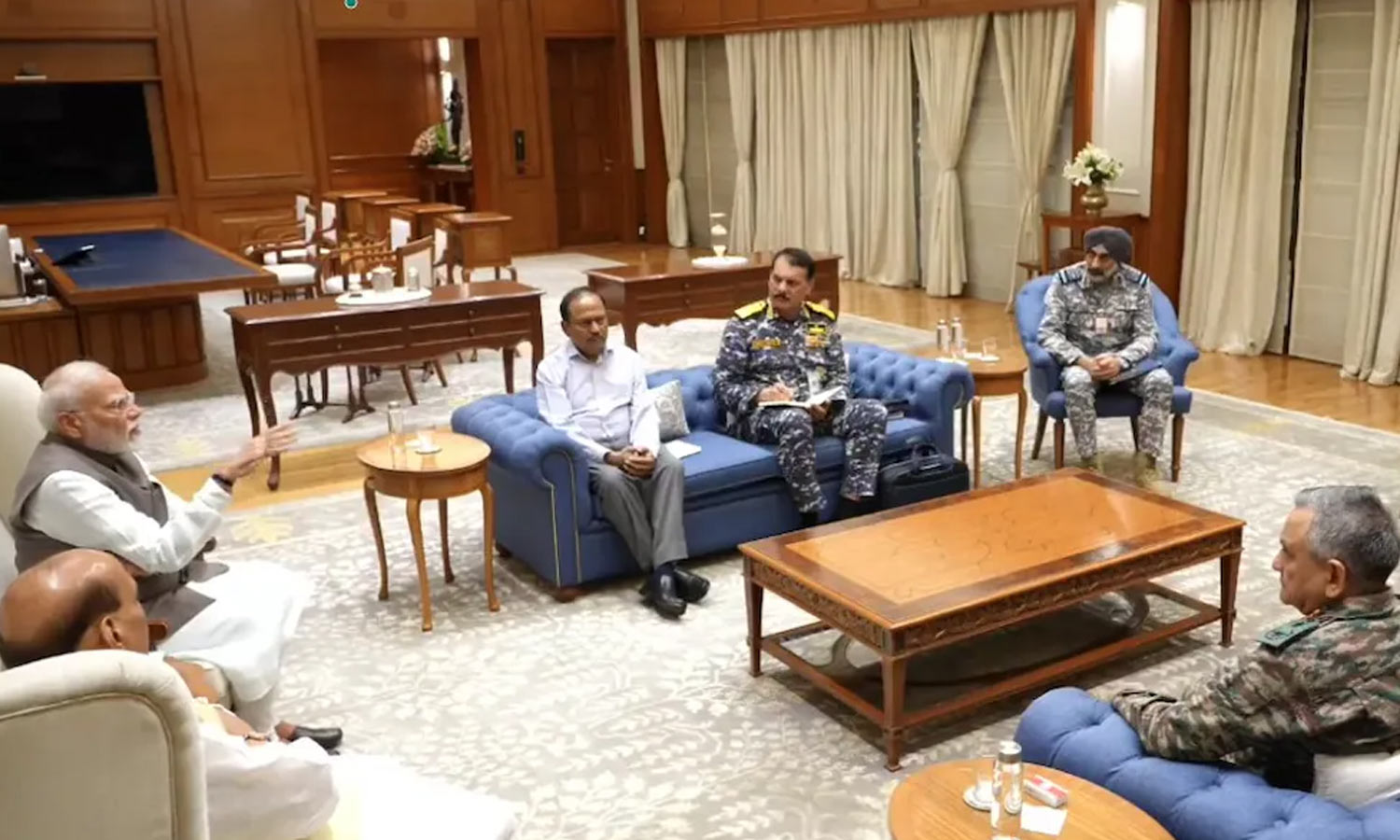 தேசிய பாதுகாப்புக்குழு தலைவர் அஜித் தோவல் இன்று காலை பிரதமர் மோடியை சந்தித்து பேசிய நிலையில், தற்போது முப்படை தளபதிகள் பிரதமர் மோடியுடன் ஆலோசனையில் ஈடுபட்டுள்ளனர்.
