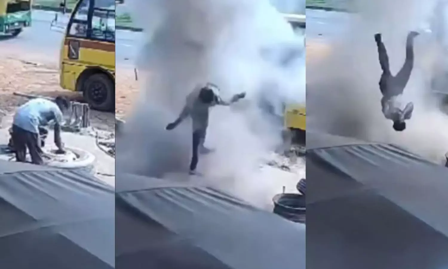 காற்றடைத்தபோது வேன் டயர் வெடித்து சிதறியதில் அந்தரத்தில் தூக்கி வீசப்பட்ட பஞ்சர் கடைக்காரர்- வீடியோ