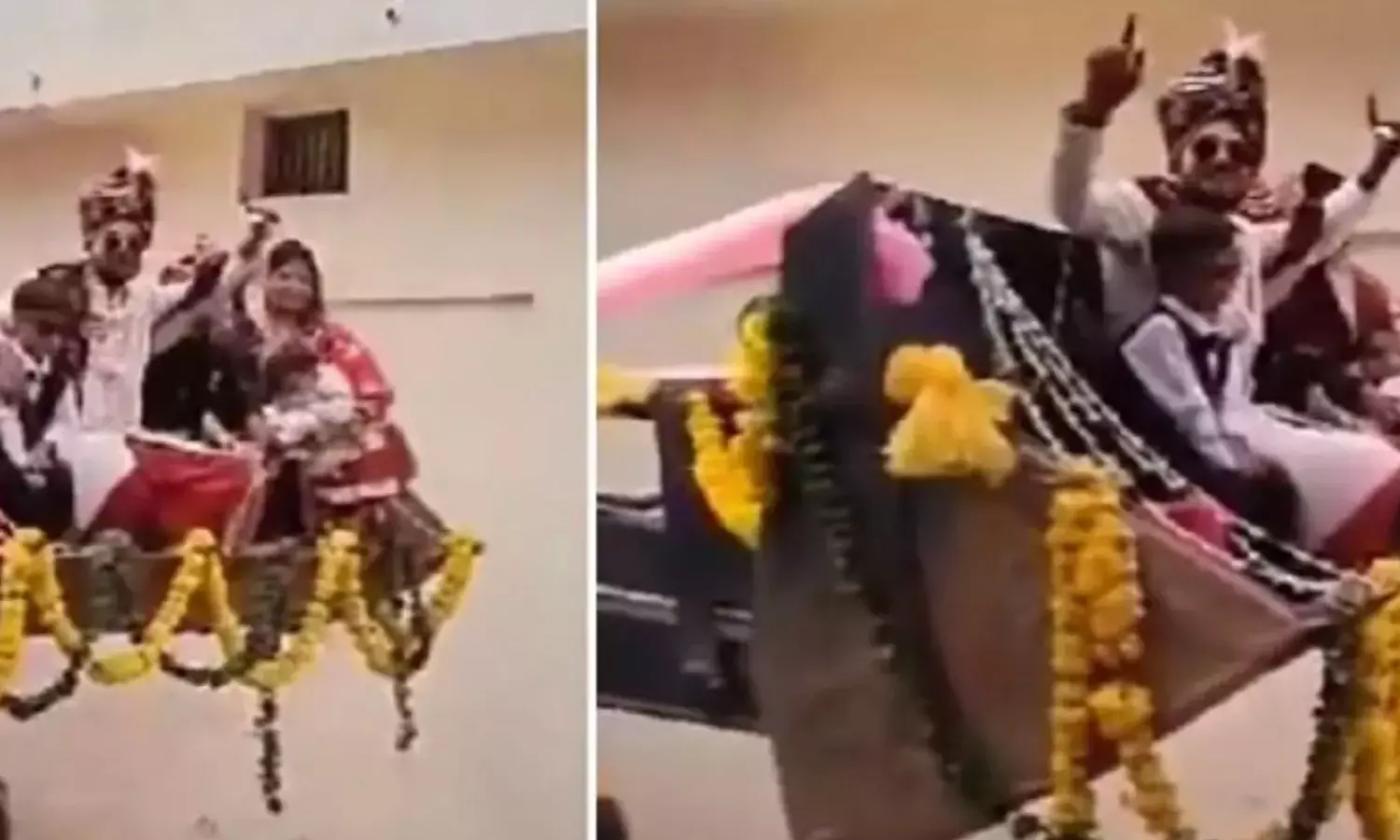 கோரக்பூரை சேர்ந்த மணமகன், மணமகளையும், உறவினர்களையும் புல்டோசர் வாகனத்தில் ஊர்வலமாக அழைத்து சென்றுள்ளார். புல்டோசரின் மண் அள்ளும் எந்திர பாகத்தில் சில இருக்கைகளை போட்டு மணமக்கள் அமர்ந்து இருக்கிறார்கள். மேளதாள இசைக்கு மணமகன் அமர்ந்தபடியே உற்சாகத்தை வெளிப்படுத்துகிறார். சில நேரங்களில் அருகில் கூடுதல் இருக்கைகளை போட்டு குழந்தைகள், உறவினர்கள் அமர்ந்தபடி புகைப்படம் எடுத்துக் கொள்கிறார்கள்.