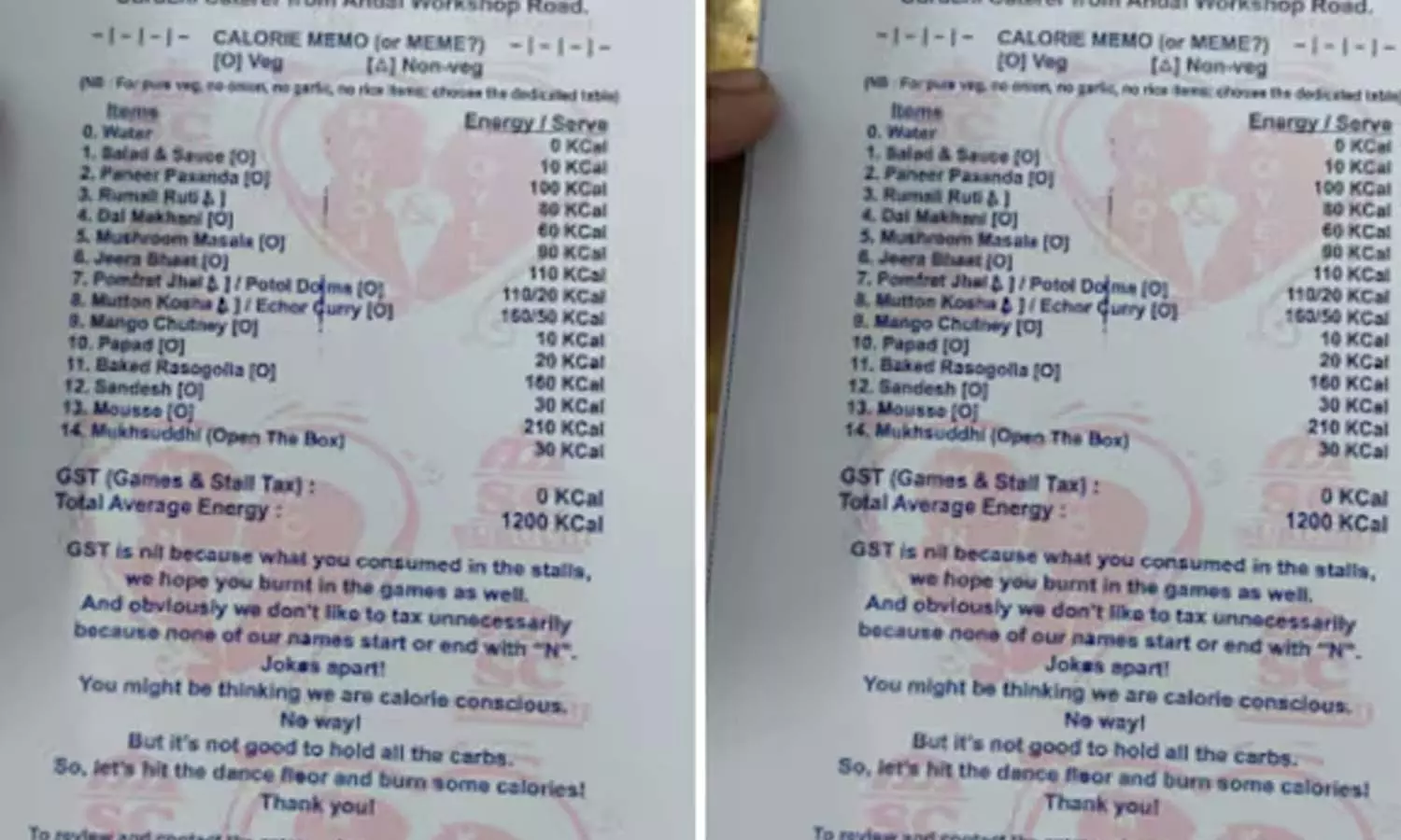 இந்நிலையில் மேற்கு வங்கத்தில் நடைபெற்ற ஒரு திருமணத்தின் போது பரிமாறப்பட்ட உணவுகளின் கலோரிகள் குறித்த விபரங்களை விருந்தினர்களுக்கு தெரிவித்து ஆச்சரியப்பட வைத்துள்ளனர். இதுதொடர்பாக உணவு மெனு குறித்த புகைப்படம் தற்போது இணையத்தில் பரவி வருகிறது.