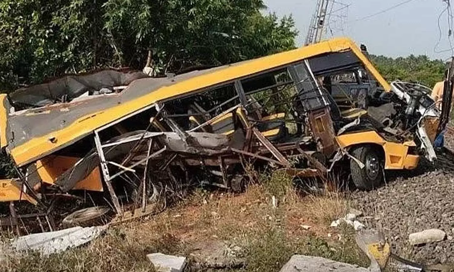 ரெயில் பள்ளி வேன் மீது மோதிய கோர விபத்தில் 3 மாணவர்கள் உயிரிழந்தனர். இந்த விபத்தில் பள்ளி வேன் முற்றிலுமாக உருக்குலைந்தது.