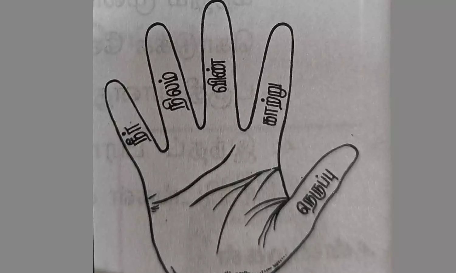 கட்டை விரலின் நுனியும், சுண்டு விரல் நுனியும் தொட்டு க்கொண்டு இருக்க வேண்டும். மற்ற விரல்கள் நேராக இருக்க வேண்டும்.
