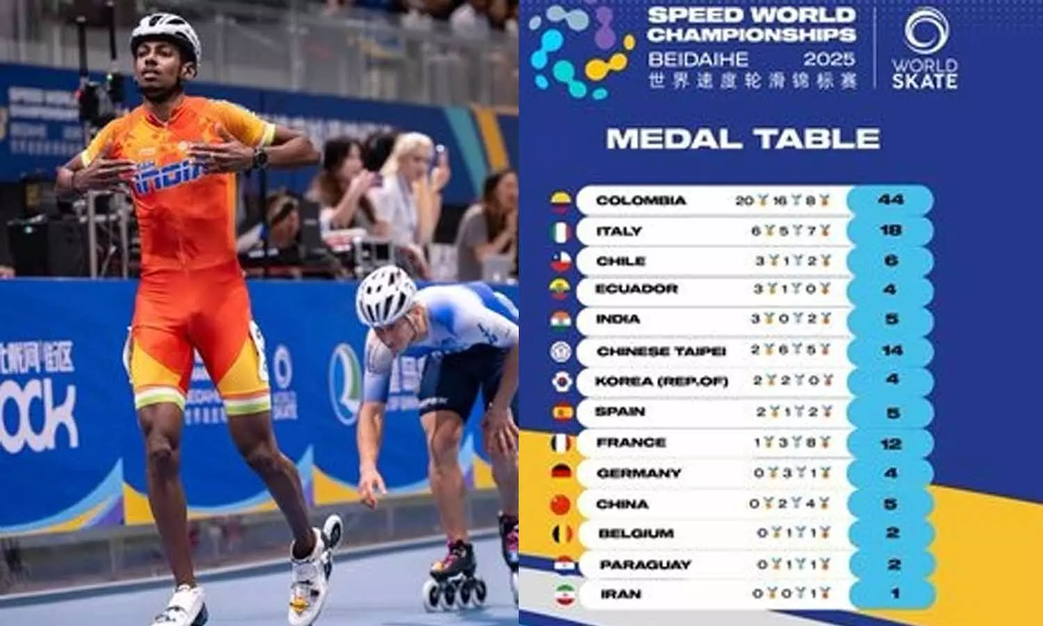இதன்மூலம் உலக வேக ஸ்கேட்டிங் சாம்பியன்ஷிப் வரலாற்றில் முதல் முறையாக இந்தியா பதக்கப்பட்டியலில் 5-வது இடத்தை பிடித்து சாதனை படைத்துள்ளது.