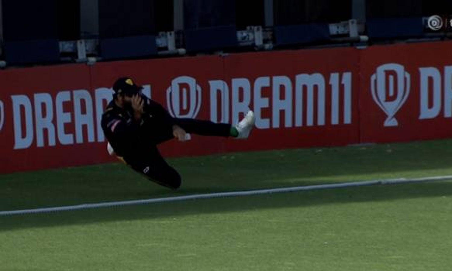 பின்நோக்கி ஓடிய அவர் பந்தை பாய்ந்து பிடித்தார். பந்தை பிடித்த வேகத்தில் விழுந்த அவர் சறுக்கிக் கொண்டு பவுண்டரி லைனை தொடும் வகையில் சென்றார். பவுண்டரி லைனை தொடுவதற்குள் பந்தை தூக்கி உள்நோக்கி போட்டார்.