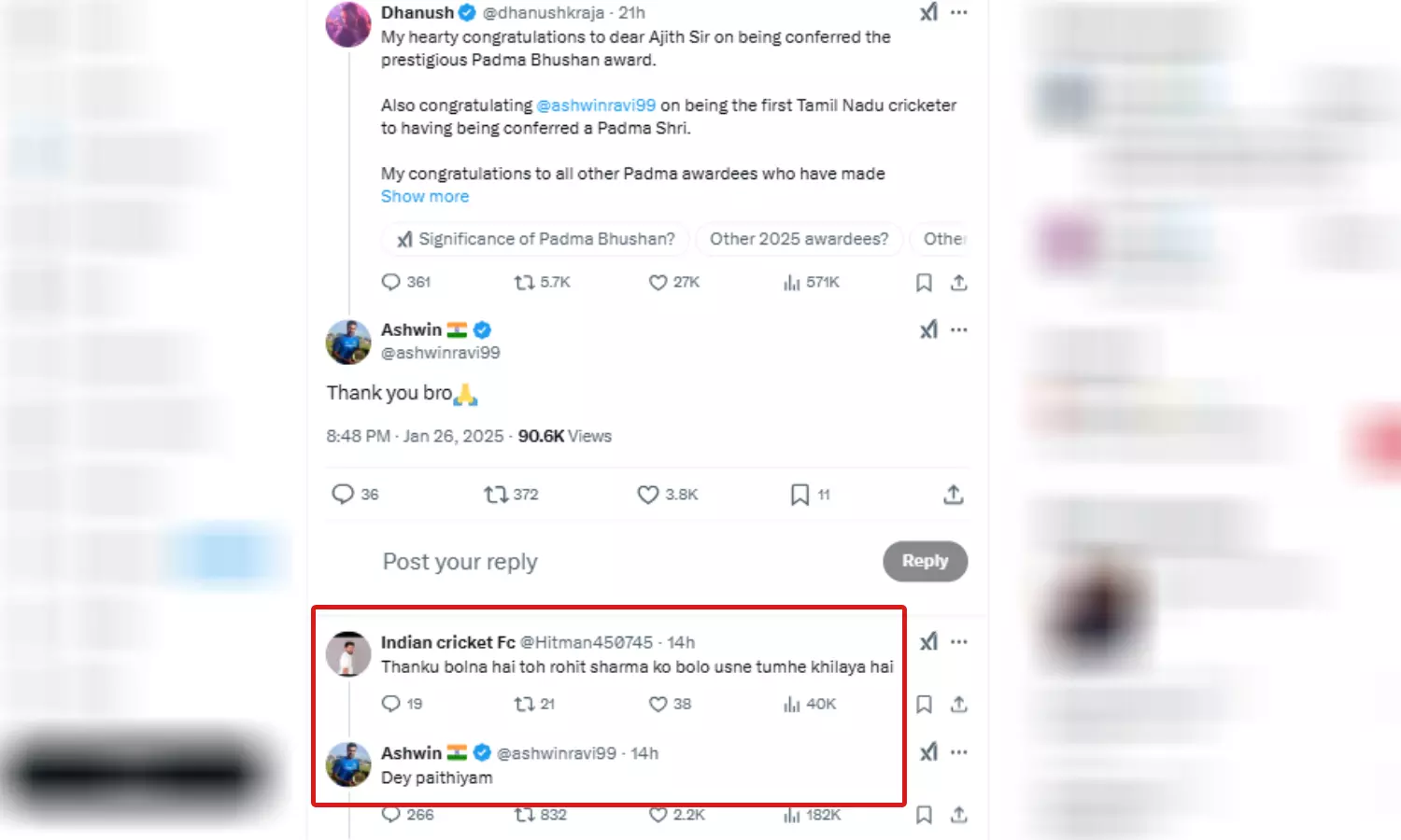 எக்ஸ் தளத்தில் தனக்கு வாழ்த்து தெரிவித்த நடிகர் தனுஷ்-க்கு ரவிச்சந்திரன் நன்றி தெரிவித்து கமென்ட் செய்தார். இவரது பதிவுக்கு ஒருவர் இந்தி மொழியில் பதில் அளித்து இருந்தார். அதில், நன்றி சொல்வதாக இருந்தால் ரோகித் சர்மாவுக்கு சொல்லுங்க என்று கூறியிருந்தார். இதற்கு பதில் அளித்த அஸ்வின், "டேய் பைத்தியம்" என்று குறிப்பிட்டுள்ளார்.
