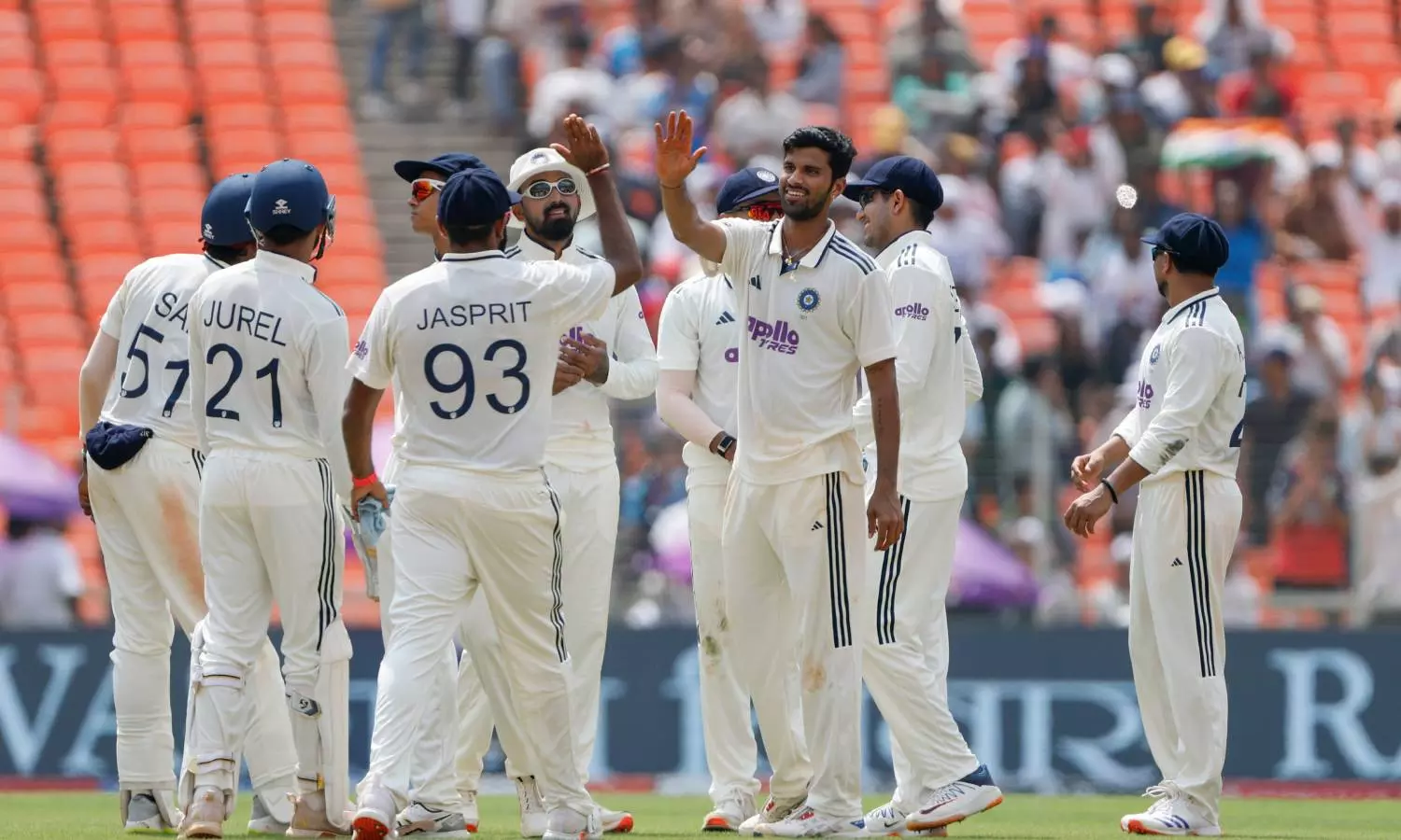 பின்னர் முதல் இன்னிங்சை விளையாடிய இந்தியா அணி 5 விக்கெட் இழப்புக்கு 448 ரன் குவித்து டிக்ளேர் செய்தது. 3 வீரர்கள் சதம் அடித்தனர். கே.எல். ராகுல் 100 ரன்னும், துருவ் ஜூரல் 125 ரன்னும் ரவீந்திர ஜடேஜா 104 ரன்னும் எடுத்தனர்