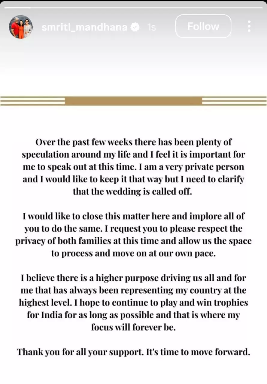 இந்த நிலையில் திருமணம் தள்ளிவைக்கப்பட்ட சில வாரங்களுக்கு பின் ஸ்மிருதி மந்தனா தற்போது, தனது திருமணம் ரத்து செய்யப்பட்டது என்று இன்ஸ்டாகிராமில் அவர் பதிவிட்டுள்ளார்.