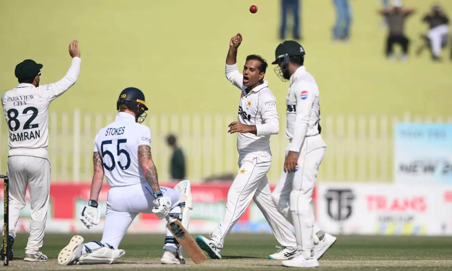 பின்னர் பாகிஸ்தான் முதல் இன்னிங்சை தொடங்கியது. ஒரு கட்டத்தில் பாகிஸ்தான் 177 ரன்கள் எடுப்பதற்குள் 7 விக்கெட்டுகளை இழந்திருந்தது. சாத் ஷகீல் அபாரமாக விளையாடி 134 ரன்கள் விளாசினார். அவருக்கு துணையாக 9-வது வீரராக களம் இறங்கிய நோமன் அலி 45 ரன்களும், 10-வது வீரராக களம் இறங்கிய சஜித் கான் ஆட்டமிழக்காமல் 48 ரன்களும் சேர்க்க பாகிஸ்தான 344 ரன்கள் குவித்தது. இங்கிலாந்து அணி தரப்பில் ரேஹன் அகமது 4 விக்கெட்டும், சோயிப் பஷீர் 3 விக்கெட்டும் வீழ்த்தினர்.