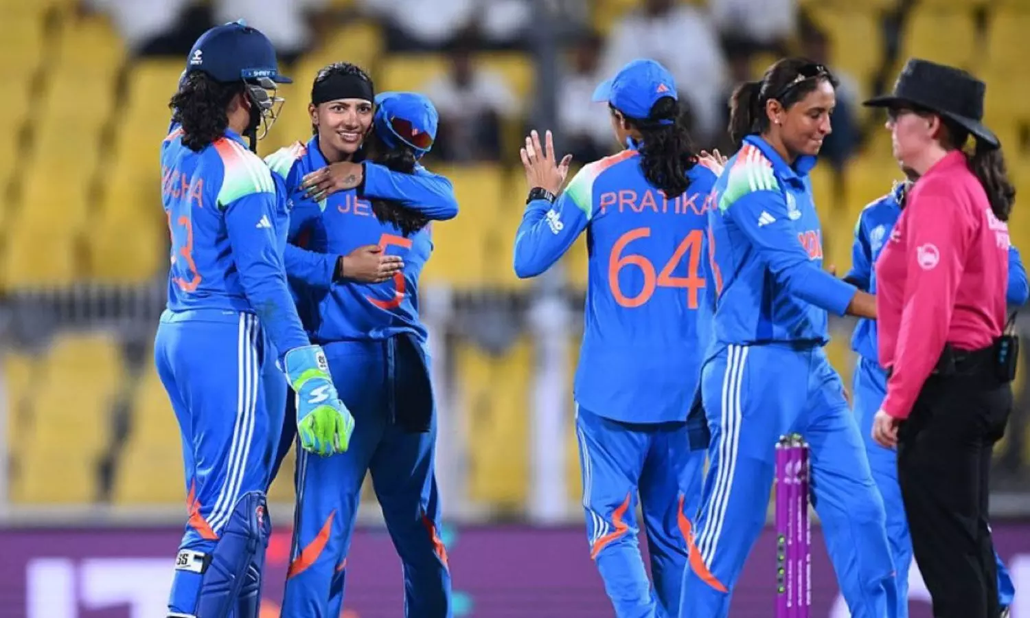2வது விக்கெட்டுக்கு பிரதிகா ராவல், ஹர்லின் தியோல் ஜோடி 67 ரன்கள் சேர்த்த நிலையில் பிரதிகா ராவல் 37 ரன்னில் வெளியேறினார். அரை சதம் அடிப்பார் என எதிர்பார்க்கப்பட்ட நிலையில் ஹர்லின் தியோல் 48 ரன்னில் ஆட்டமிழந்தார்.