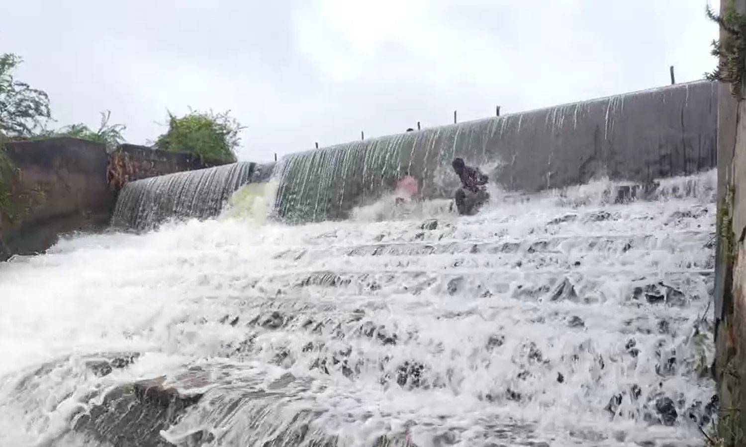 தாமல் ஏரியில் இருந்து உபரிநீர் வெளியேறும் காட்சி