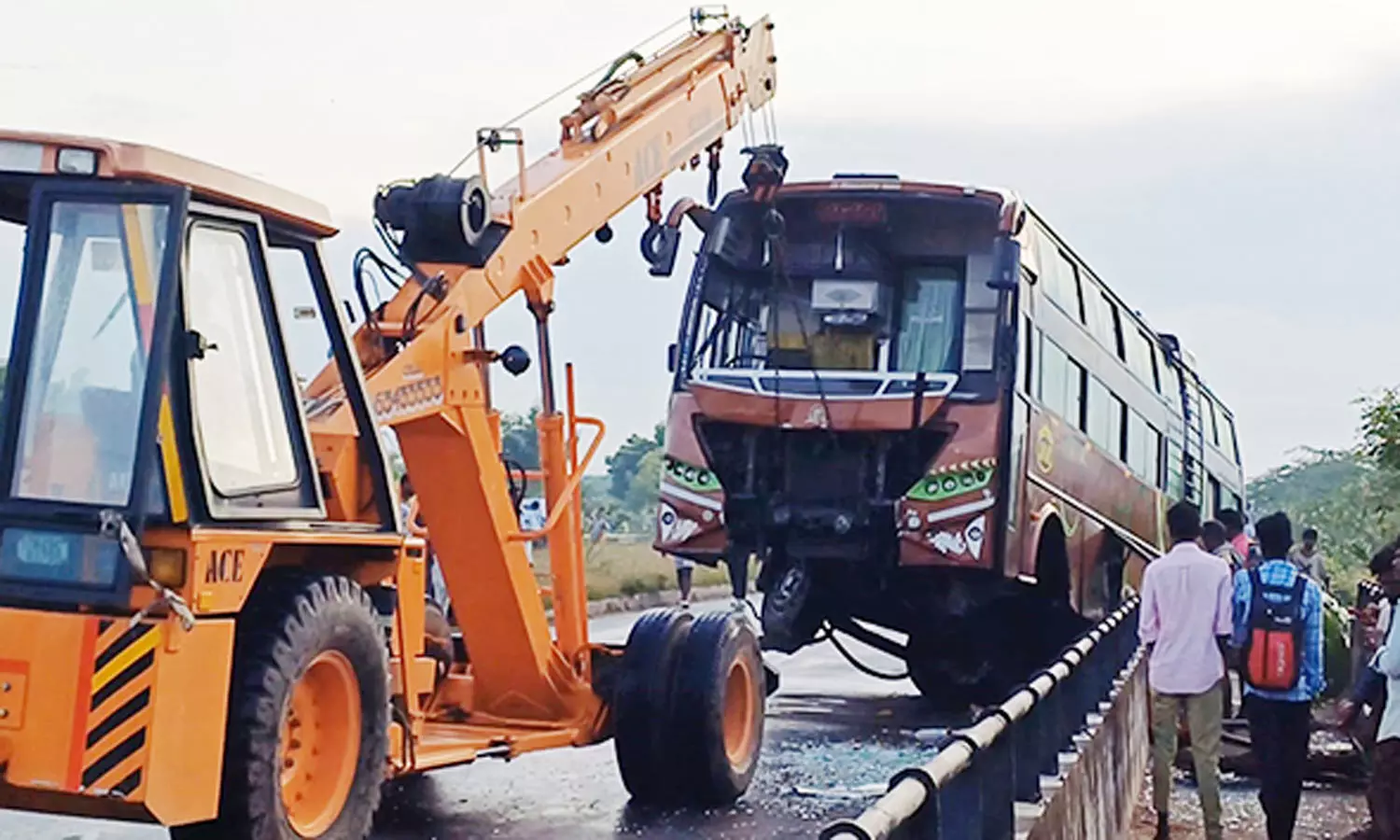 விபத்துக்குள்ளான பஸ்சை கிரேன் மூலம் மீட்ட காட்சி.