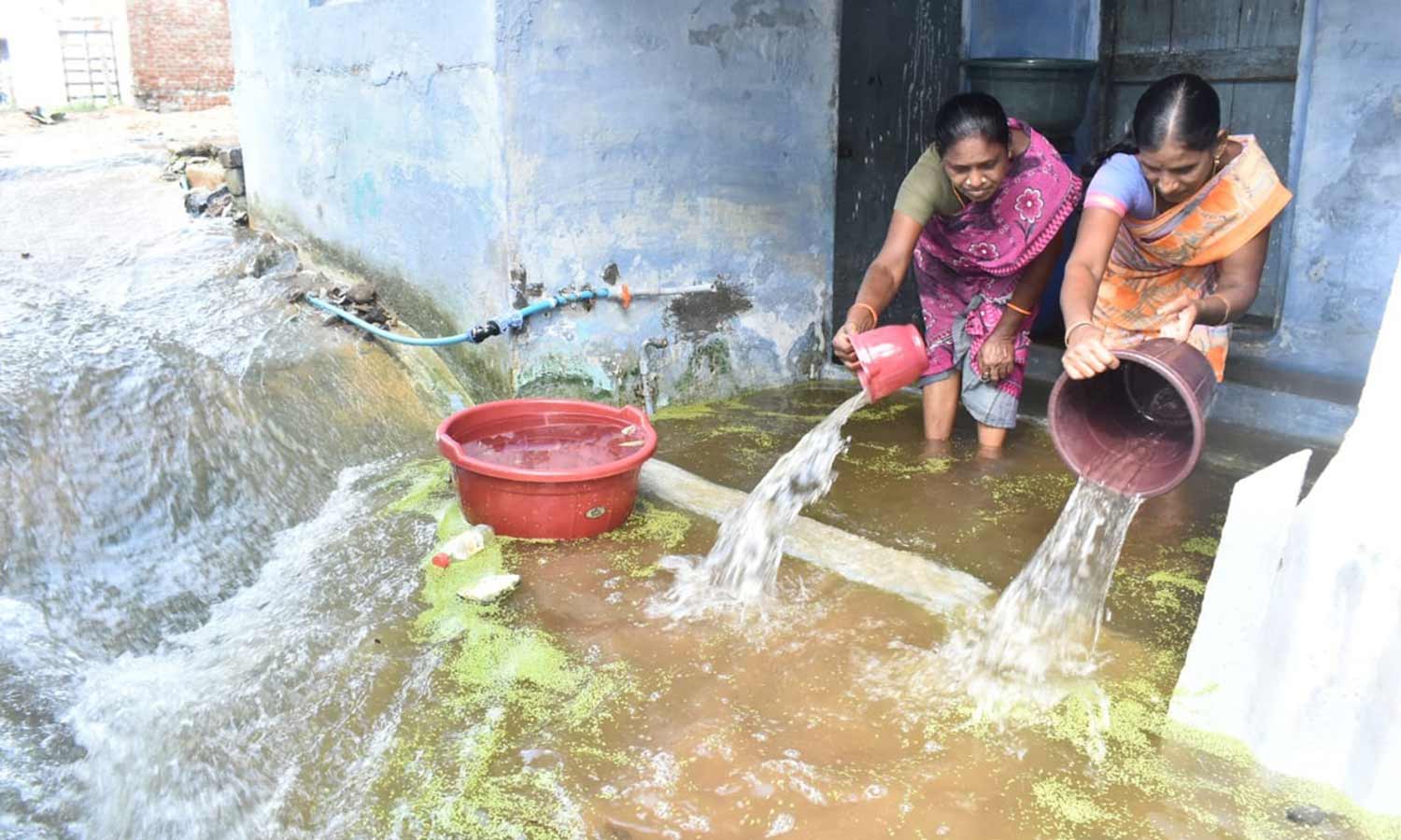 வீட்டுக்குள் புகுந்த மழைநீரை வெளிவேற்றிய பெண்கள்.