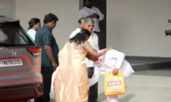 விஜயின் தாய் ஷோபா, தந்தை சந்திரசேகர் காலில் விழுந்து புஸ்ஸி ஆனந்த் ஆசீர்வாதம் பெற்றார்.