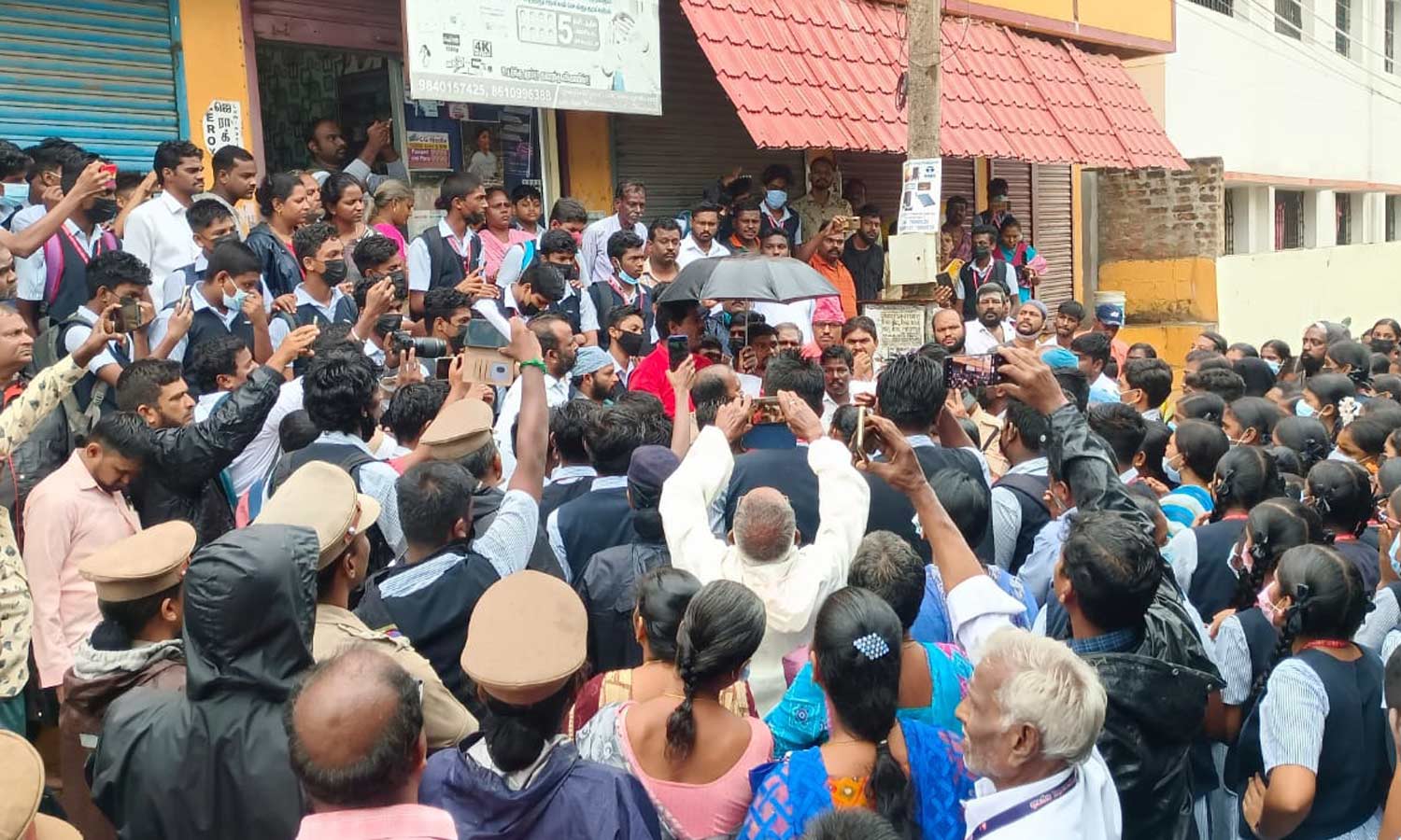 இந்த நிலையில் இன்று காலை பள்ளி மாணவ-மாணவிகள் மற்றும் அவர்களது பெற்றோர் என சுமார் 100-க்கும் மேற்பட்டோர் பள்ளியை முற்றுகையிட்டு திடீர் போராட்டத்தில் ஈடுபட்டனர். மாணவிகளுக்கு எதிராக நிர்வாகி வினோத்தின் செயல்பாட்டை கண்டித்து கோஷங்கள் எழுப்பினர்.