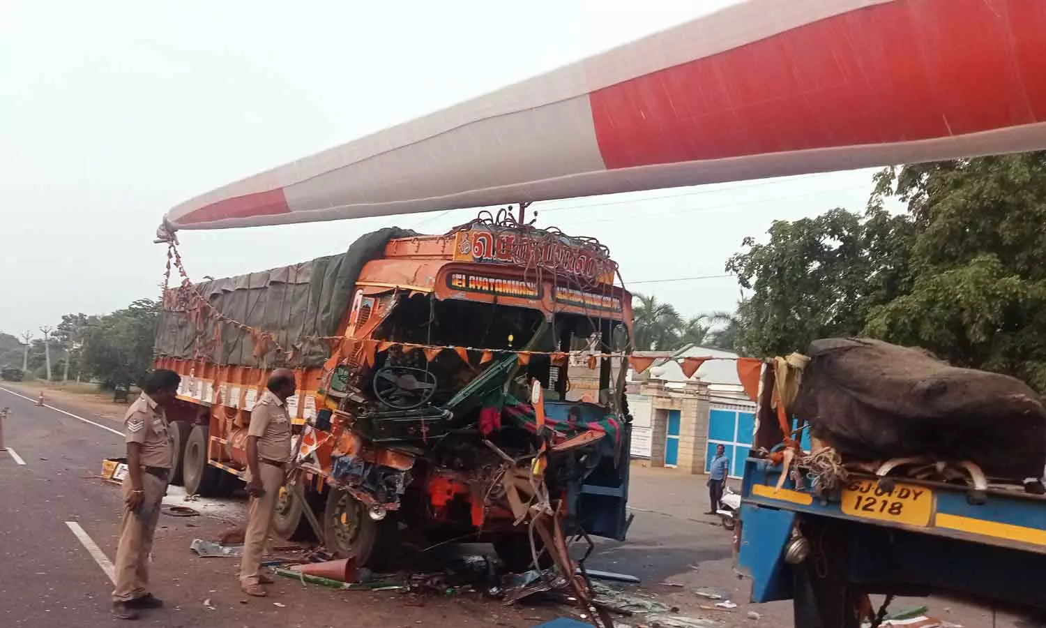 அதிகாலை 4 மணி அளவில் லாரியை ஓட்டி வந்த ராஜா சற்று கண் அயர்ந்துவிட்டார். இதனால் சாலையில் பழுதாகி நின்ற காற்றாலை ஏற்றி வந்த லாரி மீது மோதினார்.