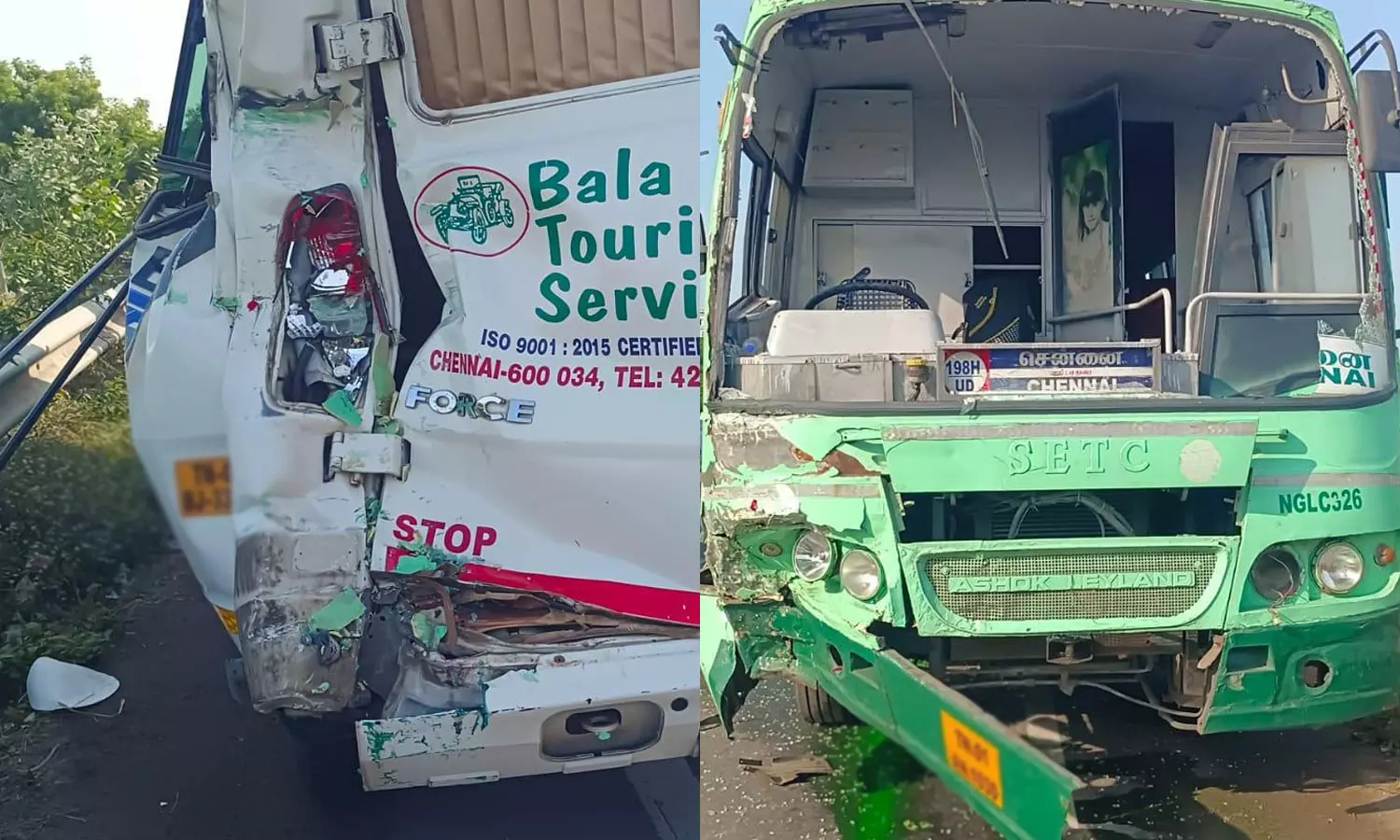 இன்று காலை 8.30 மணியளவில் அதிகாலை மதுராந்தகம் அருகே திருச்சி-சென்னை தேசிய நெடுஞ்சாலையில் வந்து கொண்டு இருந்தபோது திடீரென டிரைவரின் கட்டுப்பாட்டை இழந்த அரசு பஸ் முன்னாள் சென்று கொண்டு இருந்த டெம்போ வேன் மீது பயங்கரமாக மோதியது. இதனால் டெம்போ வேன் முன்னால் சென்ற சுற்றுலா பஸ்சின் பின்பகுதியில் மோதியது.