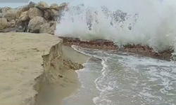மயிலாடுதுறை மாவட்டம் சந்திரபாடி மீனவ கிராமத்தை கடல் நீர் சூழ்ந்தது. 15 அடி உயரம் வரை கடல் அலைகள் எழும்புவதால் மீனவ கிராம மக்கள் அச்சம் அடைந்துள்ளனர்.