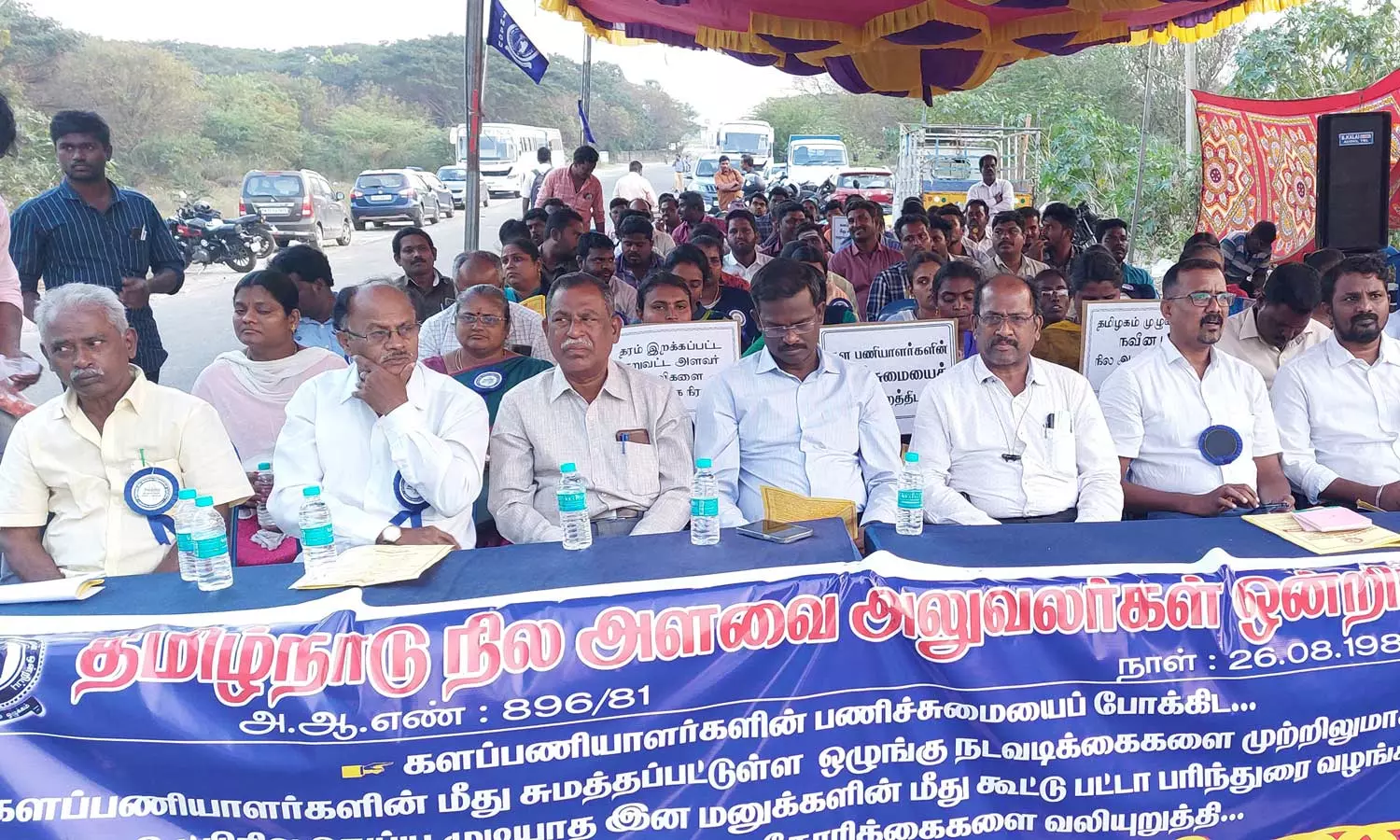 - தமிழ்நாடு நில அளவை அலுவலர்கள் சார்பில் தர்ணா போராட்டம் நடைபெற்றது.