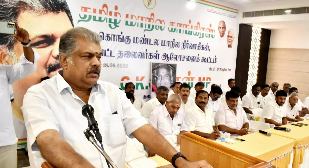 தமிழ் மாநில காங்கிரஸ் கட்சியின் கொங்கு மண்டல மாநில நிர்வாகிகள், மாவட்ட தலைவர்கள் ஆலோசனை கூட்டம் ஈரோட்டில் இன்று நடந்தது. கூட்டத்திற்கு தமிழ் மாநில காங்கிரஸ் கட்சியின் தலைவர் ஜி. கே. வாசன் எம்.பி. தலைமை தாங்கினார்.