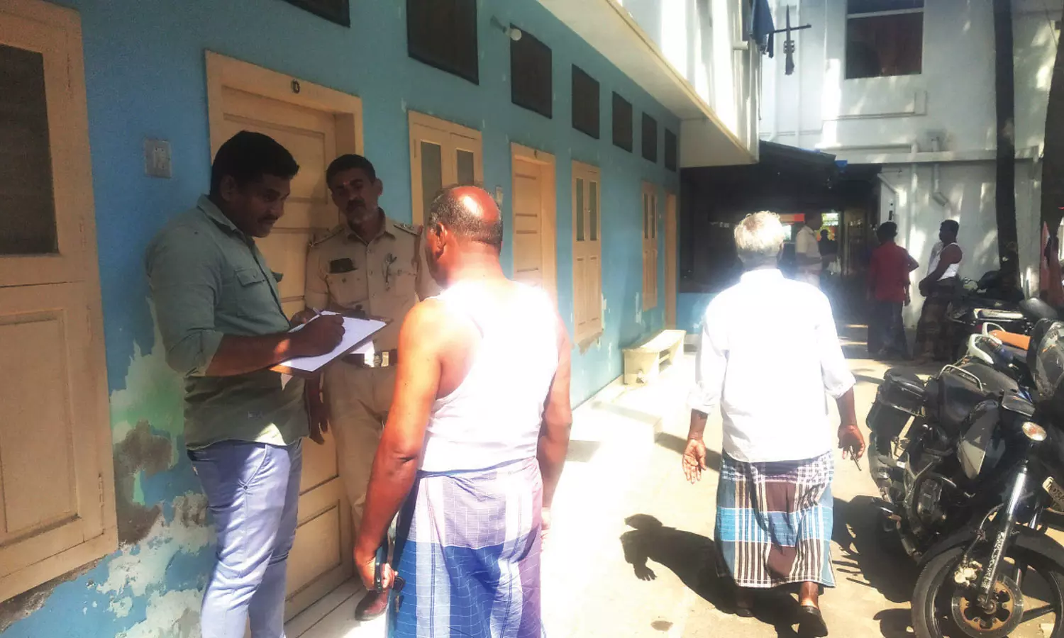 லாட்ஜ் ஊழியர்களிடம் போலீசார் விசாரணை நடத்தியதை காணலாம்.