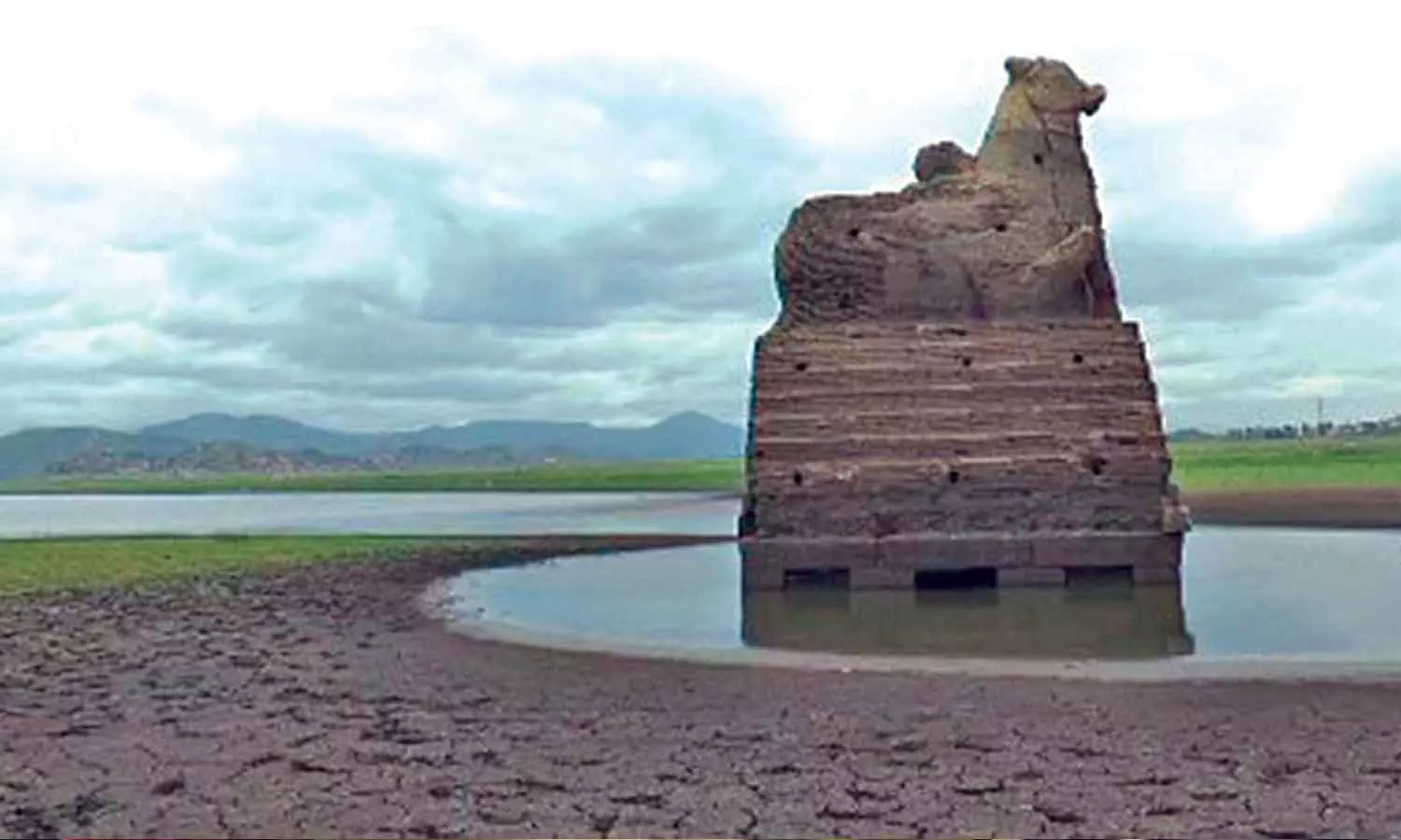 நீர்மட்டம் குறைந்ததால் மேட்டூர் அணையில் மூழ்கிய நந்தி சிலை பீடத்துடன் முழுமையாக வெளியே தெரிகிறது.