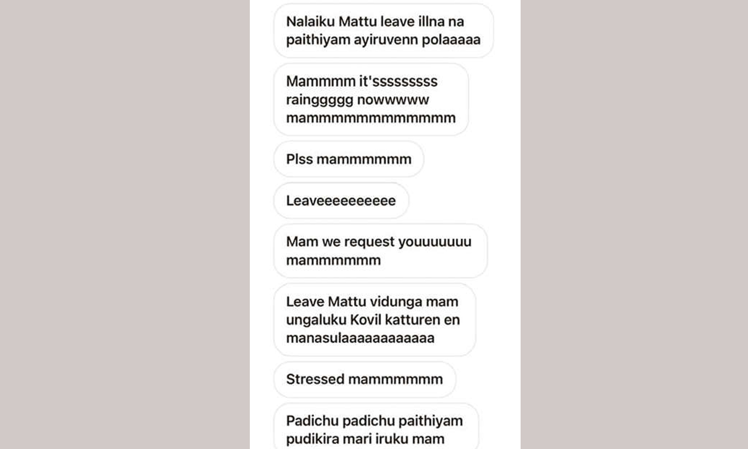 இதேபோல மற்றொரு மாணவர், ''மார்க் வாங்கல மேம்... நாளை எல்லாரும் கேட்பாங்க... உங்களையே நம்பியிருக்கேன். எனக்காக மட்டுமில்லை. அனைவருக்கும் சேர்த்து தான்'' என குறிப்பிட்டிருக்கிறார். இதேபோல சில மாணவர்களும் பள்ளி, கல்லூரிக்கு விடுமுறை கோரி குறுந்தகவல் அனுப்பியிருக்கின்றனர். ஒருவர் செல்லமே...லீவு விடுங்க செல்லமே... என அன்பாகவும் கேட்டிருக்கிறார். மாணவர்களின் கோரிக்கைகளை பார்த்த கலெக்டர் பள்ளி, கல்லூரிகளுக்கு விடுமுறை விட்டுள்ளார்.