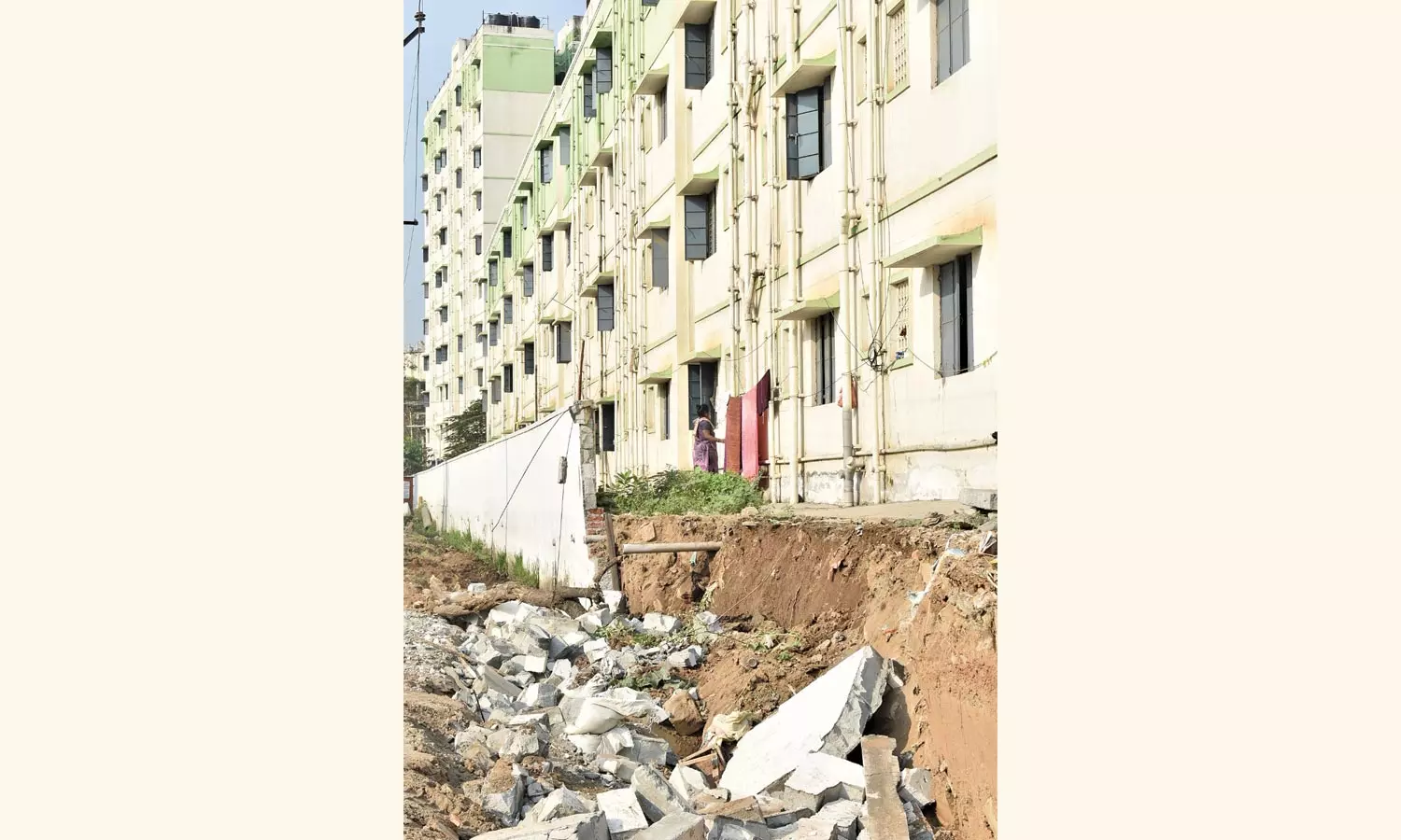 ஈரோடு கருங்கல்பாளையத்தில் அரசு அடுக்குமாடி குடியிருப்பு சுற்றுச்சுவர் திடீரென இடிந்து விழுந்தது