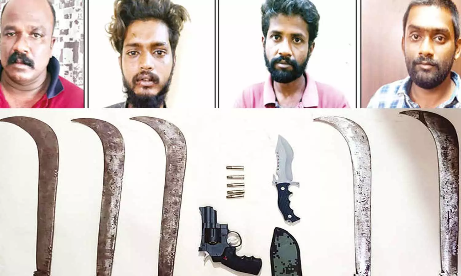 அப்போது அவர்களிடம் துப்பாக்கி, அரிவாள், வாள், கத்தி உள்ளிட்ட பயங்கர ஆயுதங்கள் இருந்ததை கண்டறிந்தனர். இதையடுத்து அங்கிருந்த கேரளாவை சேர்ந்த ஹாசிம் (வயது 39), அதே பகுதியை சேர்ந்த விபின் தாஸ்(29) ,சிவகங்கையை சேர்ந்த செல்வ கணபதி(27) , அருள்புரம் நவீன் ஆனந்த் (29) ஆகிய 4 பேரை கைது செய்தனர்.